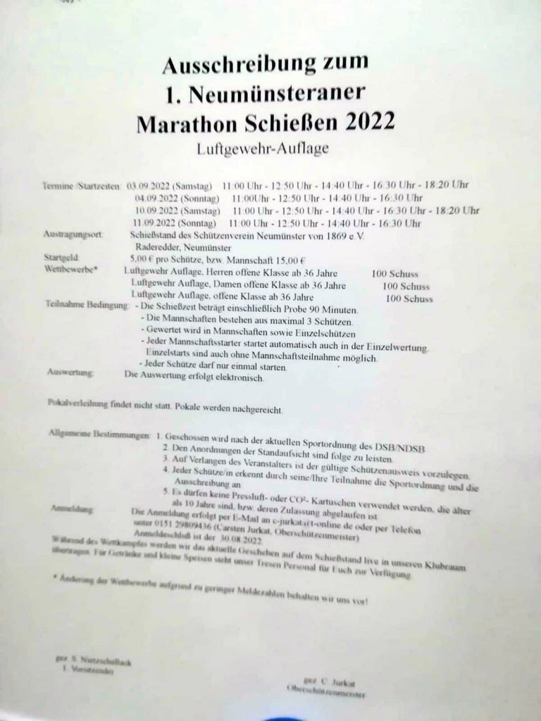 Der Schützenverein Neumünster von 1869 e. V. lädt am 03. / 04. / 10. / 11.09.2022 zum Marathonschießen 100 Schuß LG Auflage mit elektronischer Auswertung ein.