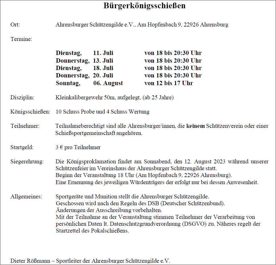 Bürgerkönigsschießen der Ahrensburger Schützengilde vom 11.07. – 20.07. jeden Di + Do ab 18 Uhr, zus. 06.08. ab 12 Uhr