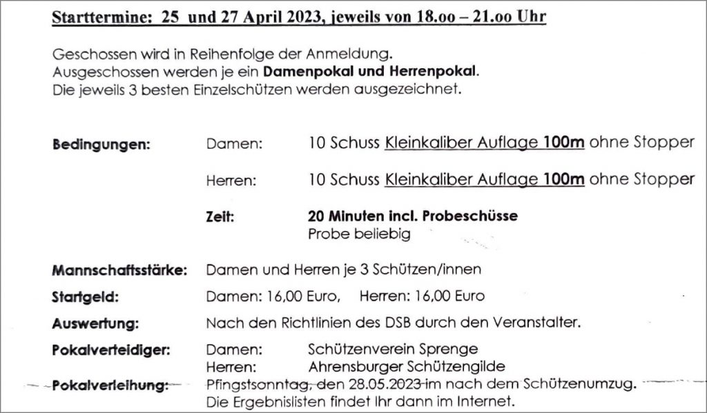 Nord-Stormarn-Pokal am 25.04. + 27.04. beim Schüzenverein Klein Wesenberg